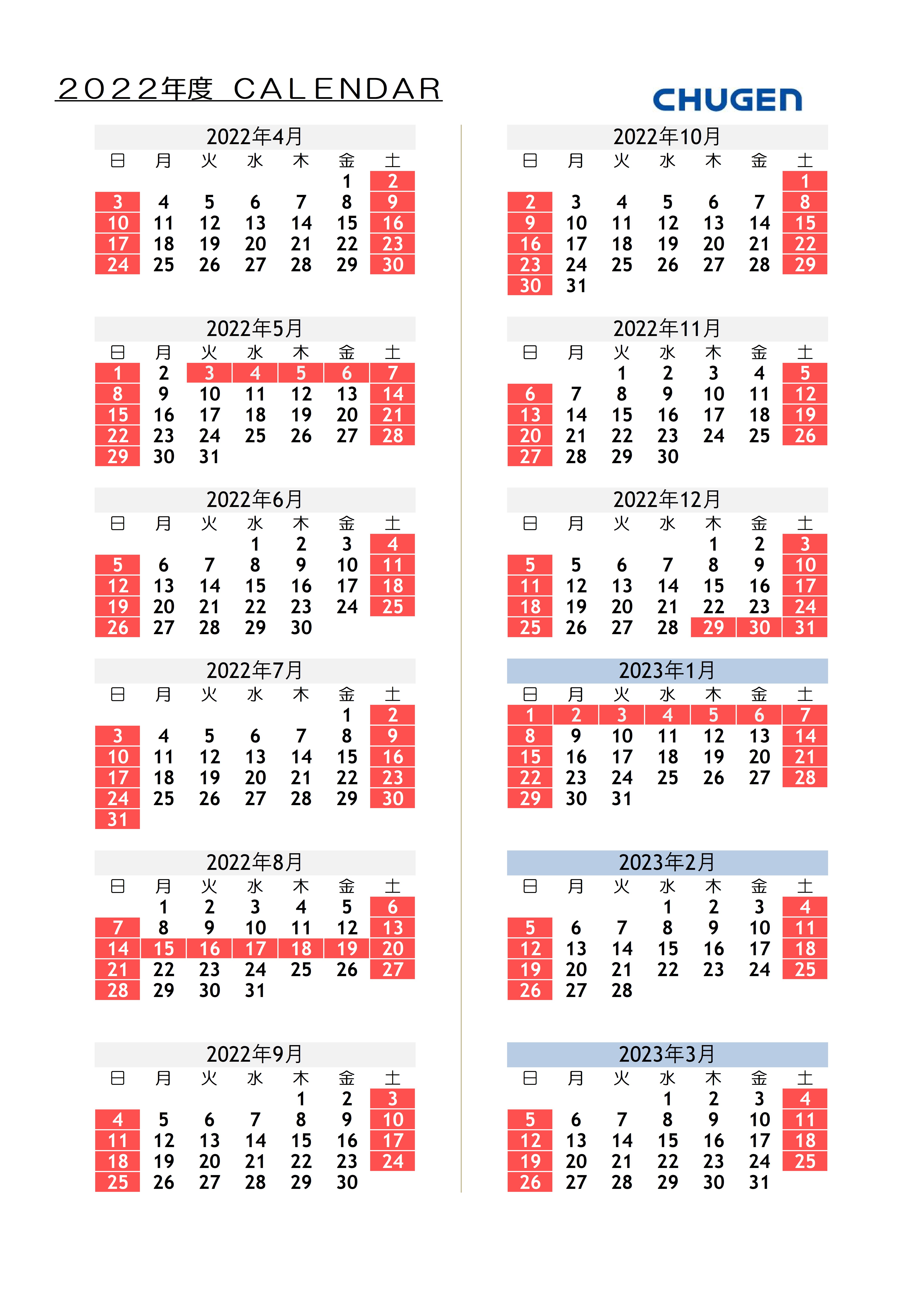 2022年度 CHUGENカレンダーを公開しました。