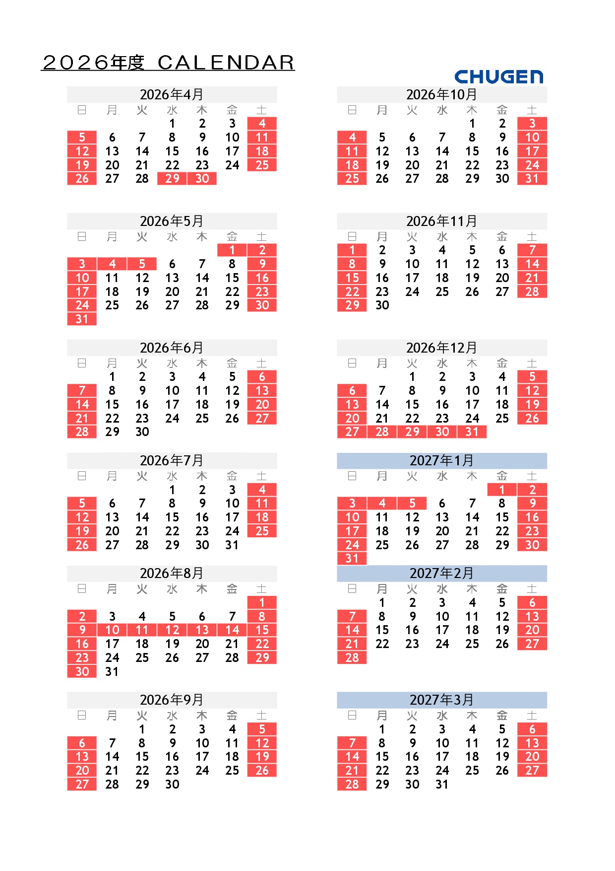 2026年度 CHUGENカレンダーを公開しました。